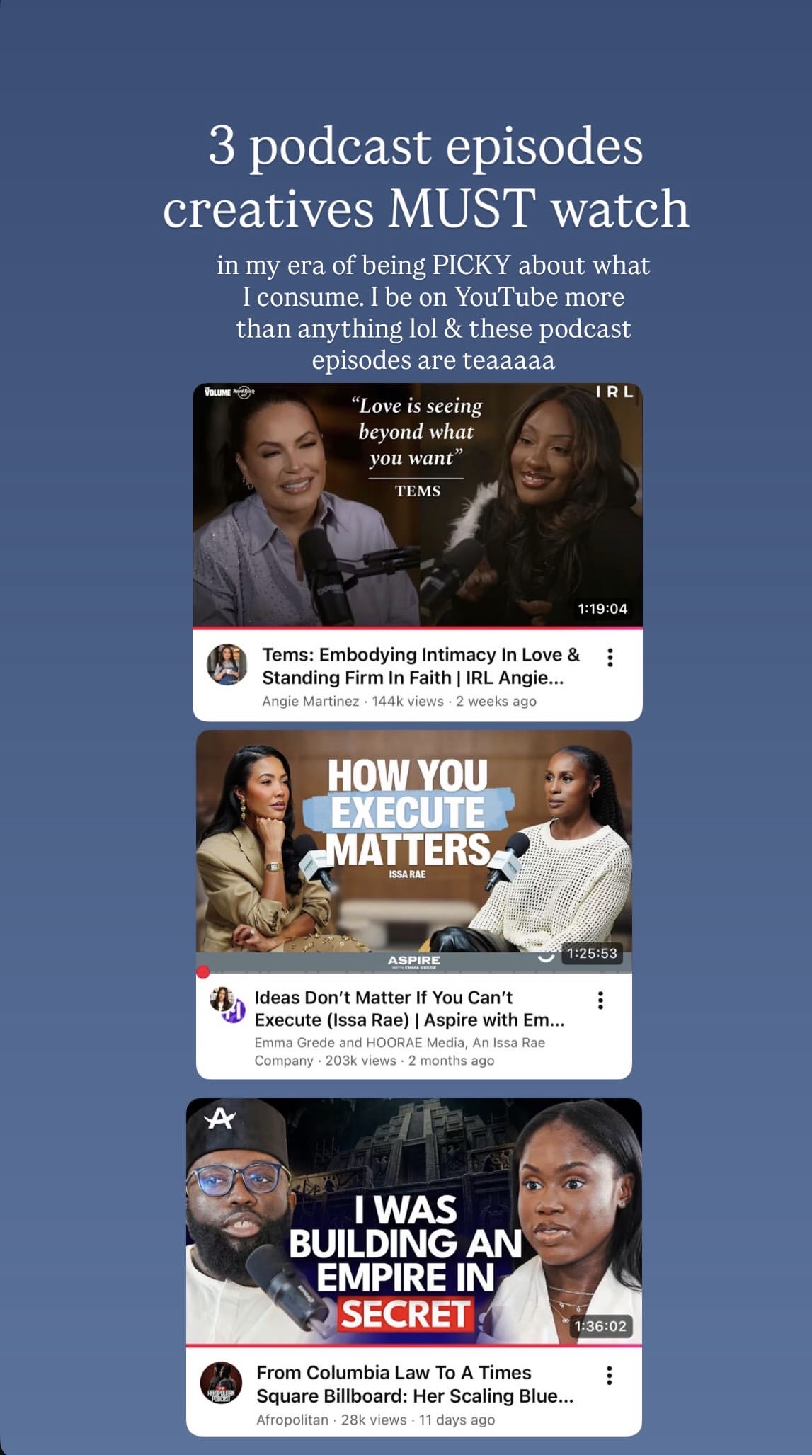 I say all this to say that I am not a scroller because I am picky about consuming things that are unique & different. I don’t like consuming anything & everything because I don’t think that’s healthy for our souls. During an Issa Rae interview, she said she likes watching things that make her laugh or feel something and i relate STRONGLY with this. Since I want to produce work that does these 2 things, I gotta consume videos that also accomplish these 2 goals.